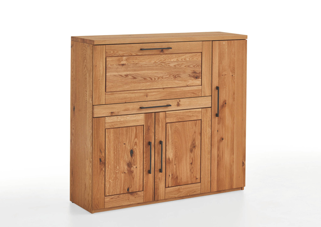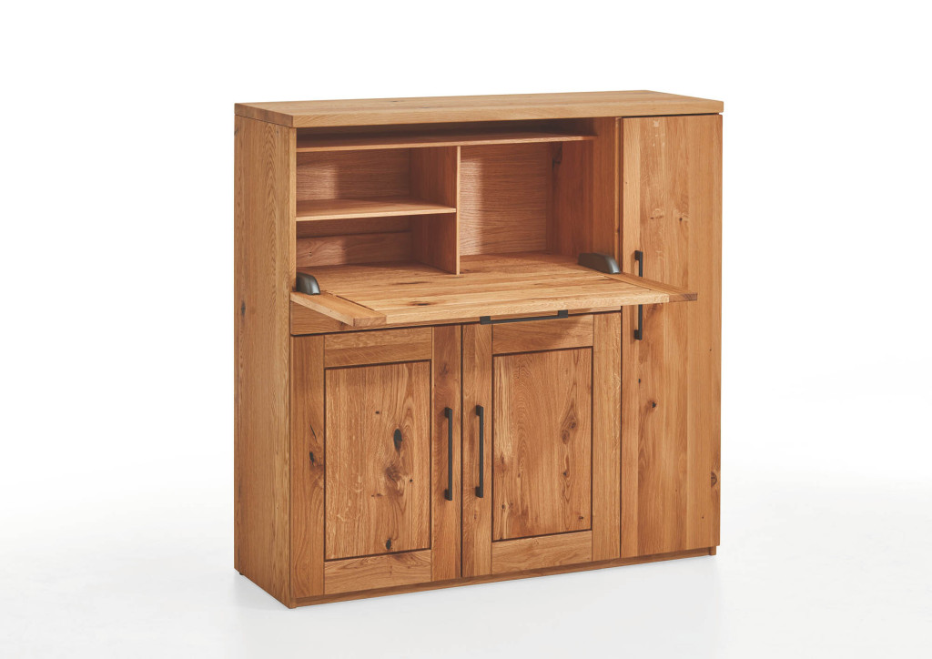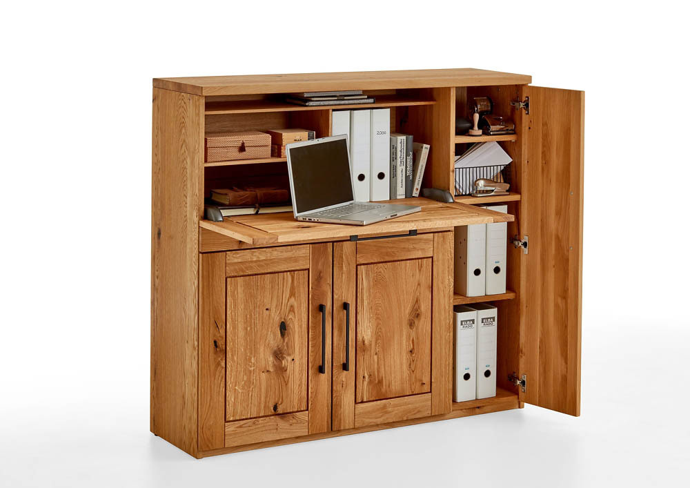 Front und Oberboden Charakter-Eiche massiv leicht gebürstet/geölt, Korpus furniert, gedämpfte Türbänder und Schubkastenführungen, Designgriffe schwarz, mit komfortabler Home-Office Innenaufteilung, BHT ca. 120/120/42 cm