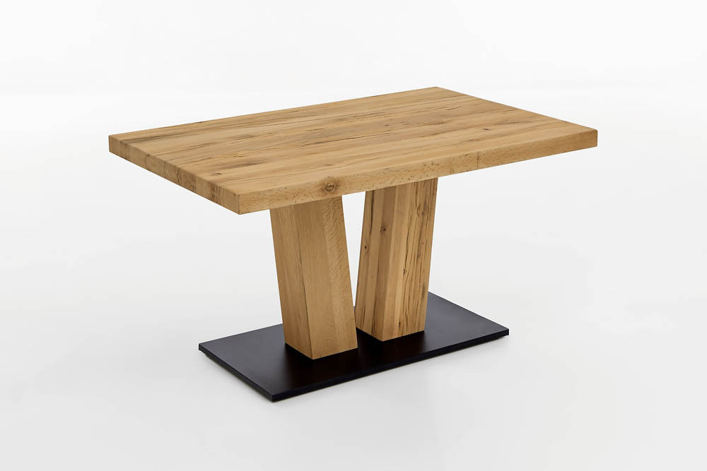 Tisch, Balkeneiche natur massiv, Wachs-Effekt Oberfläche, strukturgehobelt, Bodenplatte schwarz, LBH ca. 140/90/76 cm