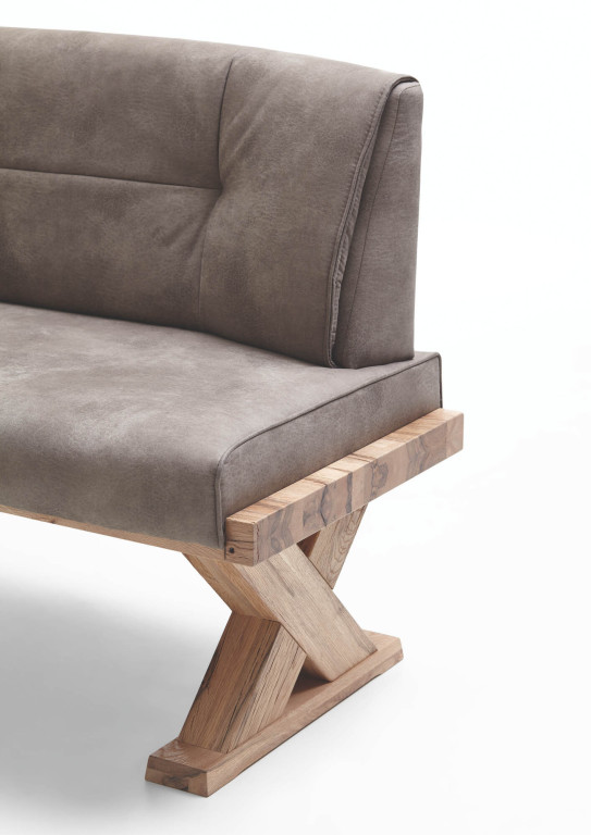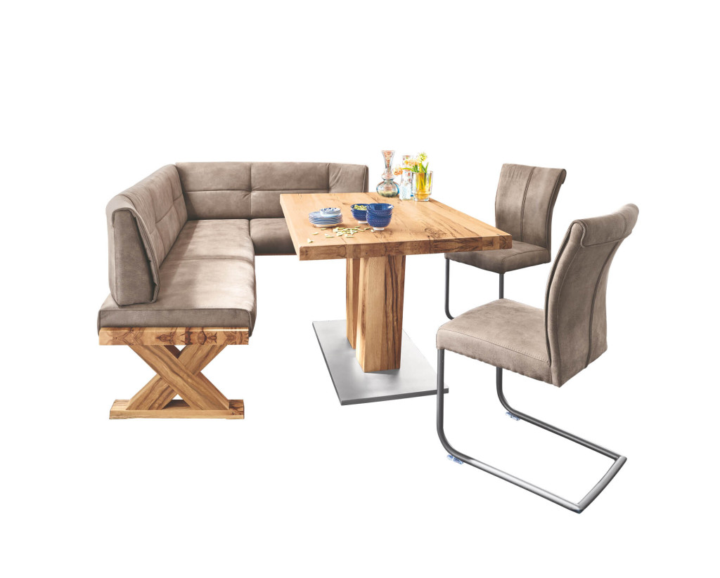 Vintage-Eckbank, Microfaser, 100% Polyester, Farbe stone, langer Schenkel links, X-Gestell Balkeneiche natur massiv, Breite ca. 202x155 cm, Höhe 87 cm, Tiefe 62 cm
