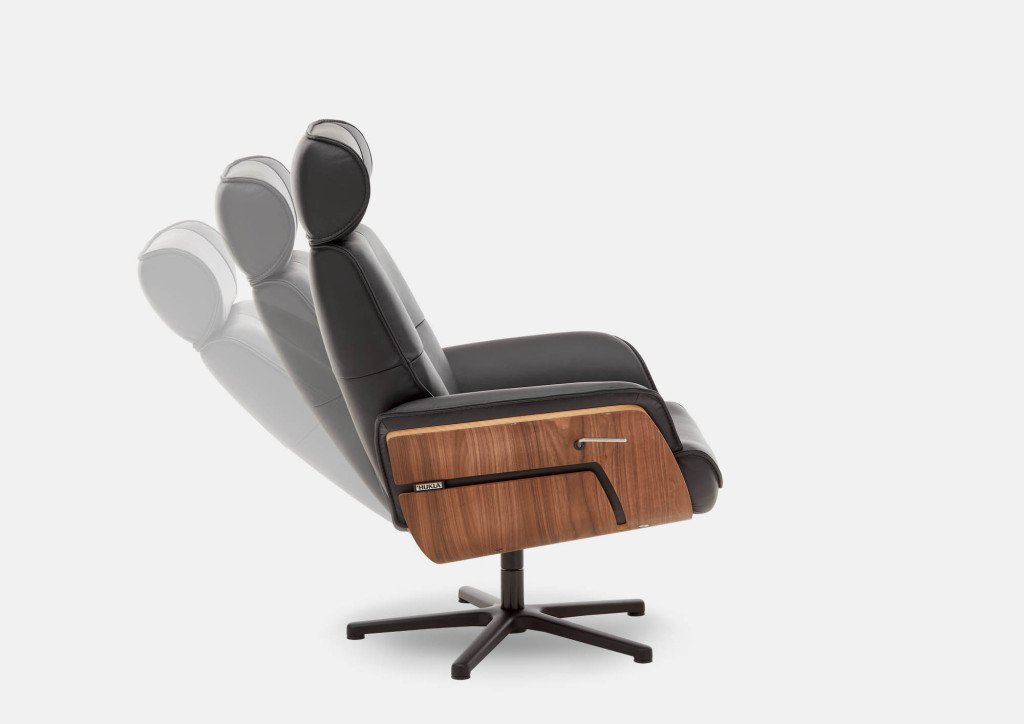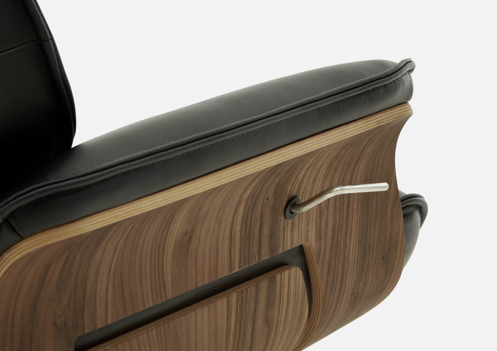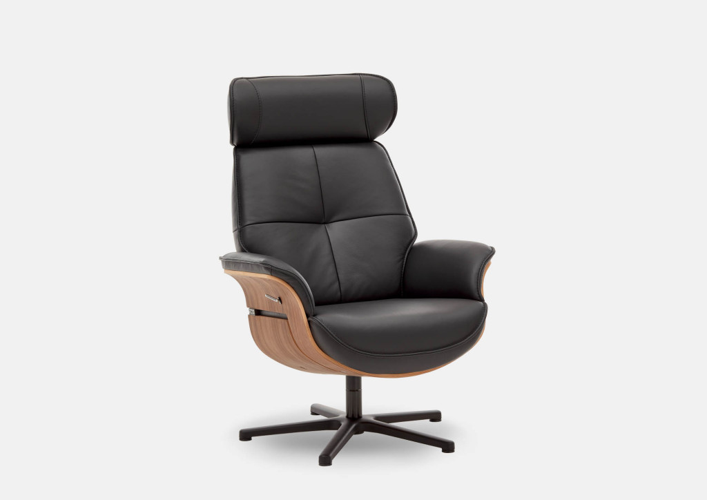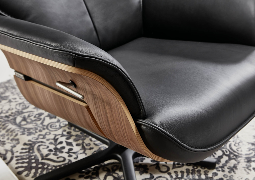 Leder, Farbe schwarz, Holz Nussbaum, Rücken, Sitz mittel, Sternfuß pulverbeschichtet schwarz, Sitzhöhe 43 cm