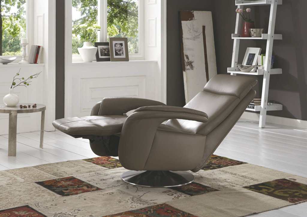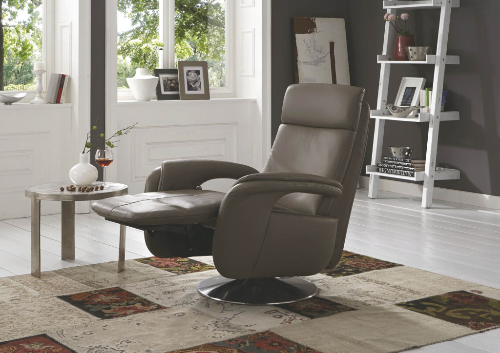 Semi-Aninlin-Leder, Farbe braun, Sitzbreite 50 cm, Sitzhöhe 45 cm, Verstellung durch Körperdruck, Drehteller edelstahlfarbig, BHT ca. 80/106/88-175 cm