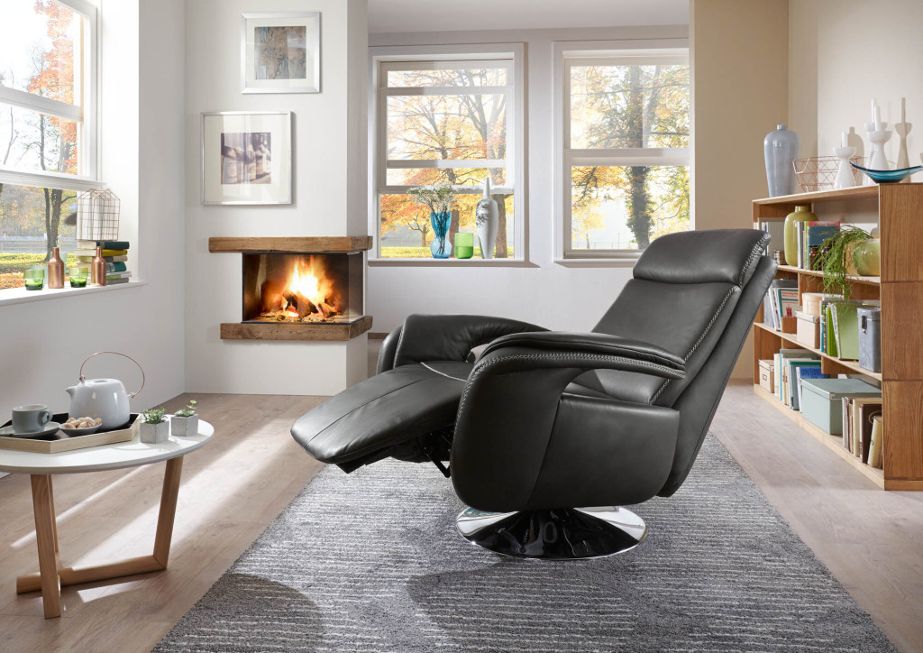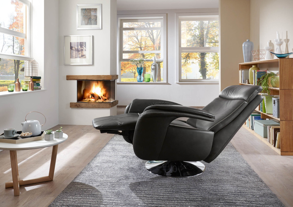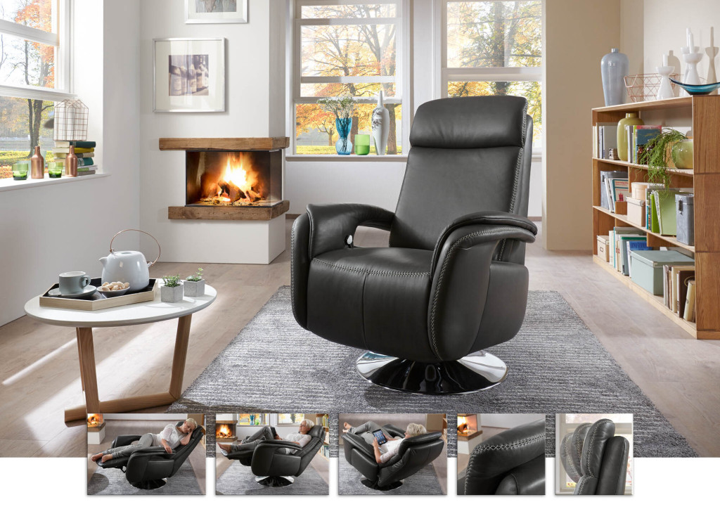 pigmentiertes Leder, Farbe schwarz, Kappnaht mit Kontrast beige, Sitzhöhe 45 cm, Sitzbreite 54 cm, Verstellung durch Körperdruck, Drehteller edelstahlfarbig, BHT ca. 84/106/88-175 cm