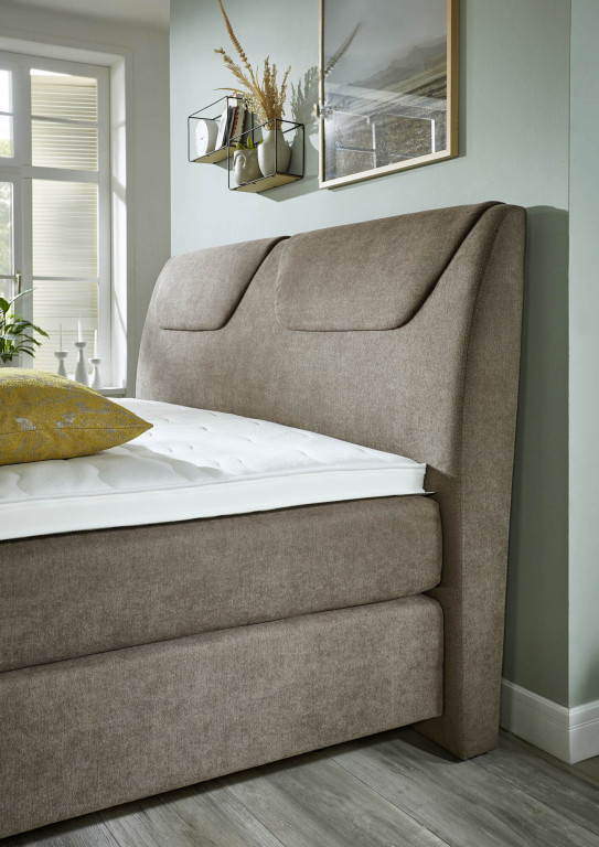 Microchenille, Nutzschicht 95 % Polyester, 5 % Nylon, Grundschicht 100 % Polyester, Farbe stone, Kopfteil Rücken unecht, Füße Schwebeoptik, Matratzen 7-Zonen Tonnentaschenfederkern H2/H3, Unterbau Taschenfederkern klassisch glatt, Topper Viscoschaum durchgehend, Liegefläche ca. 180x200 cm, BHT ca. 192/117/223 cm
