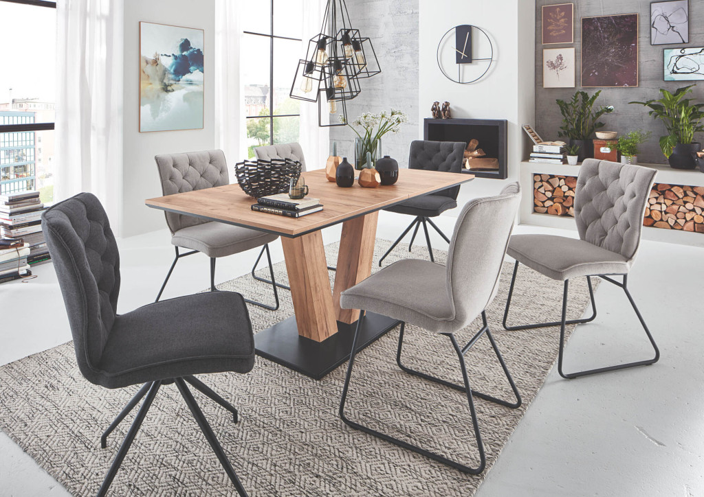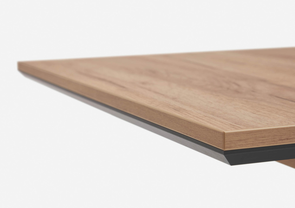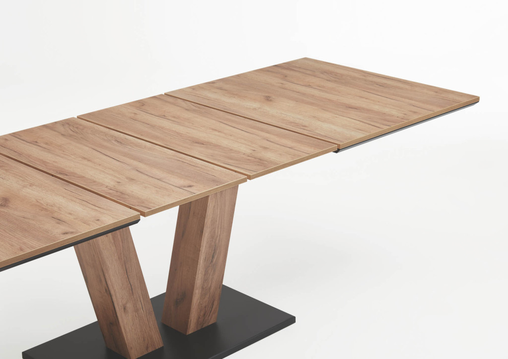 Dekor Struktureiche terra, Plattenkante schwarz abgesetzt, mit Mittelauszug, zwei innenliegende Einlegeplatten à 40 cm, Gestell V-Säule mit Bodenplatte in MDF schwarz, LBH ca. 160(240)/90/76 cm