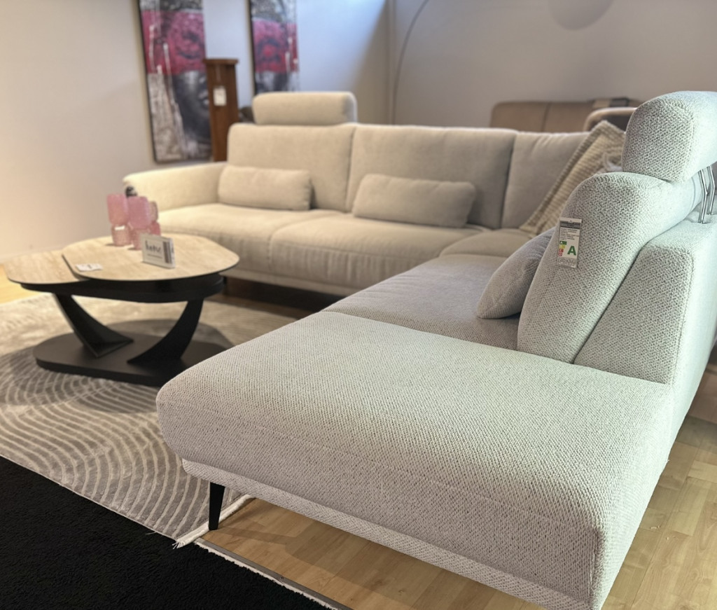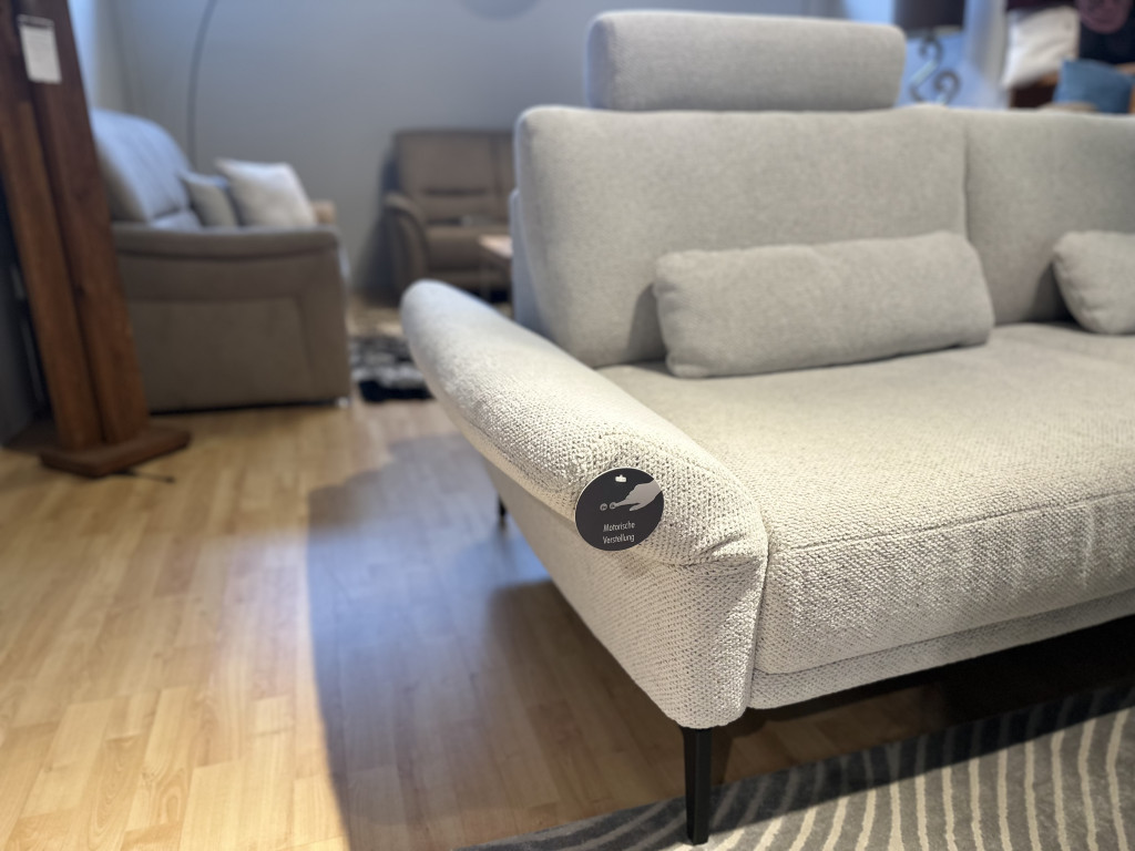-Wohnlandschaft in Stoff ecru-abklappbare Armlehne -VorziehbankStellmaß ca. 298x254cm